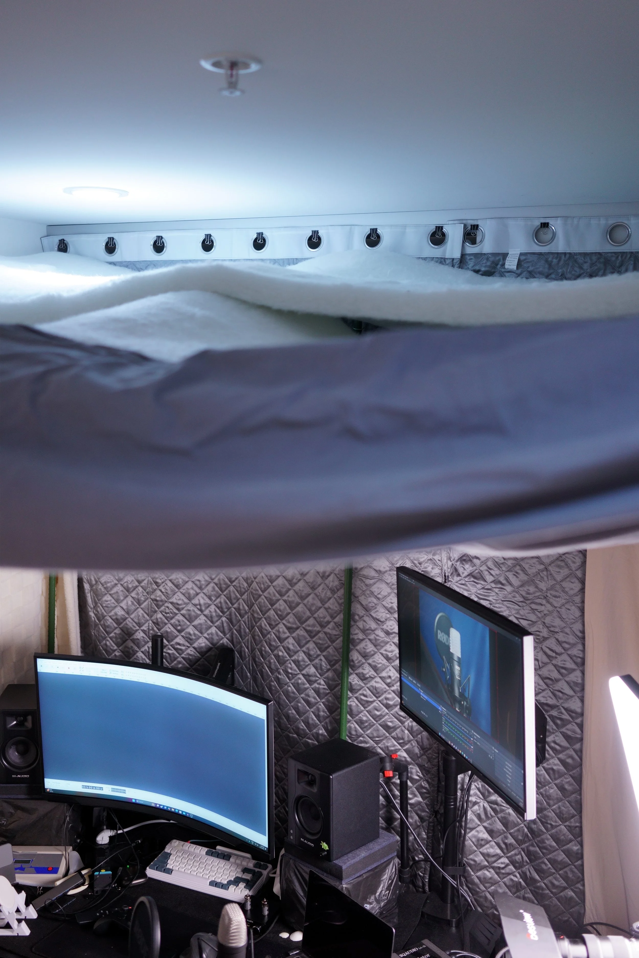 sound treatment:15m*1m*7cm sound absorbing polyester cotton-like fiber + blankets + blackout curtains + sofa cushions, fixed on gardening poles and tent poles